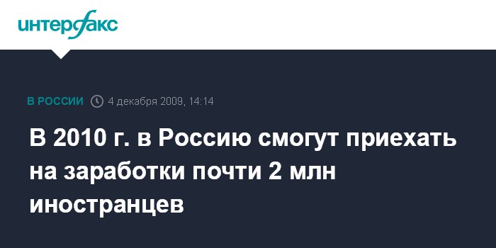 Москва. 4 декабря. INTERFAX.RU - Около 1,9 млн иностранных граждан могут быть привлечены на работу в РФ в 2010 году. Такую квоту определило российское правительство.
