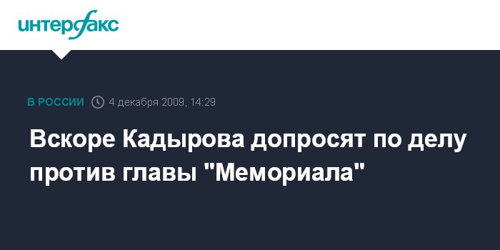 Москва. 4 декабря. INTERFAX.RU - Представитель президента Чечни Рамзана Кадырова был допрошен по уголовному делу о клевете на главу республики, возбужденному в отношении руководителя центра "Мемориал" Олега Орлова. Вскоре ожидается допрос самого Кадырова.