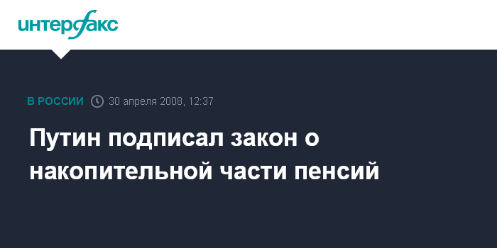 Москва. 30 апреля. INTERFAX.RU - Президент России Владимир Путин подписал федеральный закон "О дополнительных страховых взносах на накопительную часть трудовой пенсии и государственной поддержке формирования пенсионных накоплений", сообщила в среду пресс-служба главы государства.