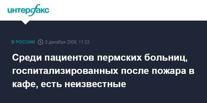 Пермь. 5 декабря. INTERFAX.RU - У пермских медиков до настоящего момента нет данных о ряде пациентов из числа госпитализированных в результате пожара в кафе "Хромая лошадь" в ночь на субботу. Согласно списку госпитализированных, опубликованному на официальном сайте администрации региона на 09:00 мск, неизвестны личности по меньшей мере 10 человек.