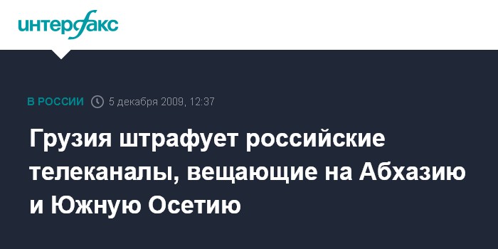 Тбилиси. 5 декабря. INTERFAX.RU - Национальная регулирующая комиссия Грузии (НКРГ) во второй раз оштрафовала ряд российских телекомпаний из-за вещания на территориях Абхазии и Южной Осетии без разрешения грузинских властей. Комиссия также потребовала от российских ТВ "немедленно прекратить вещание на территории Абхазии и Южной Осетии".