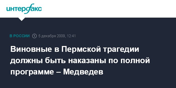 Горки. 5 декабря. INTERFAX.RU - Президент России Дмитрий Медведев требует по всей строгости закона наказать виновных в пермской трагедии. "Все, что произошло, не может быть квалифицировано иначе, как преступление. Я думаю, это абсолютно очевидно, возбуждено уголовное дело", - сказал Д.Медведев в субботу на совещании в режиме видеоконференцсвязи с главой МЧС Сергеем Шойгу, министром внутренних дел Рашидом Нургалиевым и главой Минздравсоцразвития Татьяной Голиковой.