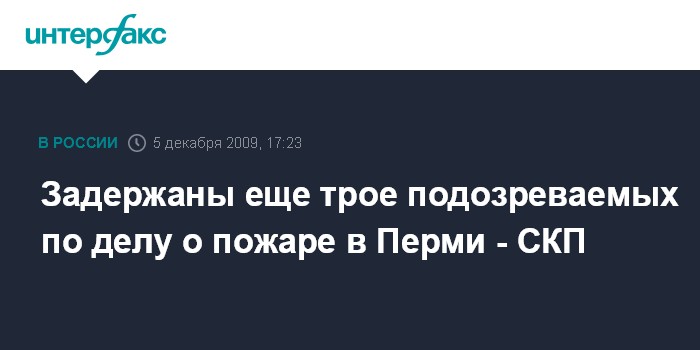 Москва. 5 декабря. INTERFAX.RU - Задержаны еще трое подозреваемых в рамках дела о пожаре в Перми, а четвертый находится в больнице в тяжелом состоянии, сообщил "Интерфаксу" вечером в субботу представитель Следственного комитета при прокуратуре (СКП) РФ Владимир Маркин.