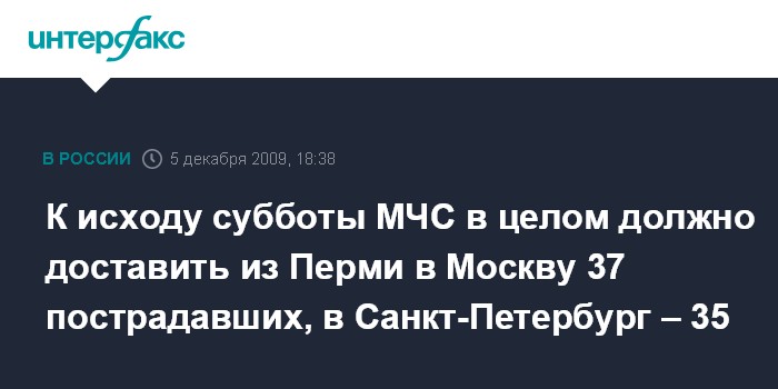 К исходу субботы МЧС в целом должно доставить из Перми в Москву 37 пострадавших, в Санкт-Петербург – 35