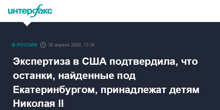 Москва. 30 апреля. INTERFAX.RU - Генетическая лаборатория госпиталя в США подтвердила, что найденные под Екатеринбургом останки принадлежат детям Николая II. Об этом сообщил губернатор Свердловской области Эдуард Россель.