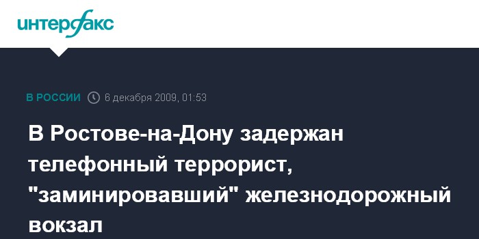 Ростов-на-Дону. 6 декабря. ИНТЕРФАКС-ЮГ - Сотрудники ГУВД по Ростовской области в минувшую субботу задержали мужчину, сообщившего по телефону о "заминировании" главного железнодорожного вокзала Ростова-на-Дону.