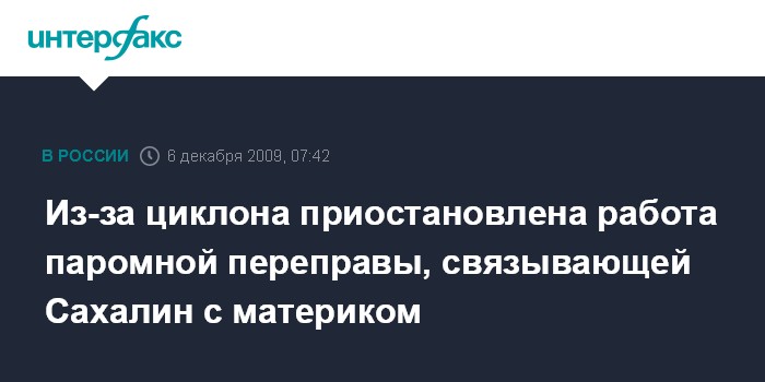 Южно-Сахалинск. 6 декабря. ИНТЕРФАКС - ДАЛЬНИЙ ВОСТОК - Паромная переправа Ванино - Холмск, связывающая Сахалин с материком, на сутки приостановила свою работу из-за циклона и шторма в море, сообщили агентству "Интерфакс - Дальний Восток" в ОАО "Сахалинское морское пароходство".