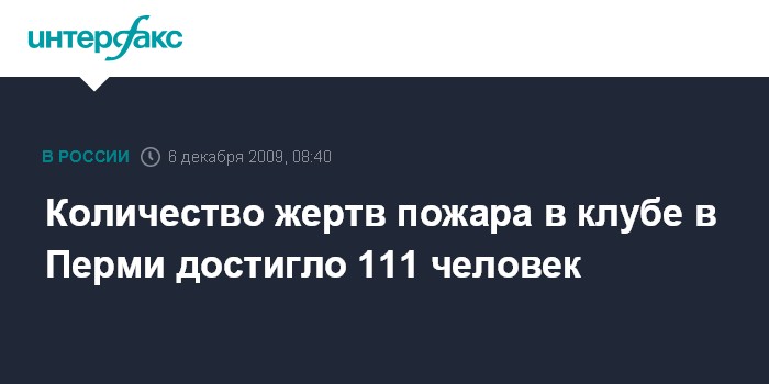 Пермь. 6 декабря. INTERFAX.RU - Количество погибших в результате пожара в Перми увеличилось до 111 человек, сообщили Интерфаксу" в пресс-службе ГУ МЧС РФ по Пермскому краю в воскресенье. "Это женщина, которая умерла в одной из Пермских больниц", - сказал собеседник агентства.