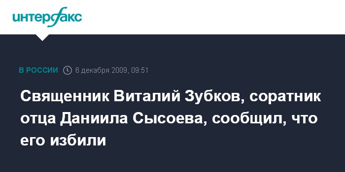Священник Виталий Зубков, соратник отца Даниила Сысоева, сообщил, что его избили