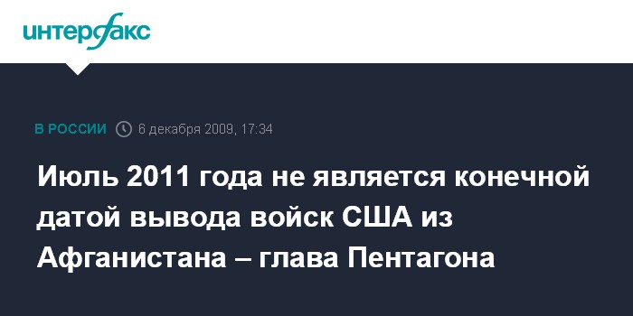 Вашингтон. 6 декабря. INTERFAX.RU - Дата вывода войск США из Афганистана, назначенная на июль 2011 года, не является "намертво установленным конечным сроком", а служит сигналом Кабулу о необходимости подготовить армию, чтобы взять на себя защиту государства, заявили министр обороны США Роберт Гейтс и госсекретарь США Хиллари Клинтон в эфире американской телекомпании Эн-Би-Си в воскресенье. "Я думаю, что здесь есть важный элемент уравнивания, отправки сигнала о решимости, но также сигнала афганскому правительству о неотложной необходимости рекрутировать, обучать и отправлять в бой молодых афганцев", - заявил Р.Гейтс в эфире программы "Встреча с прессой".
