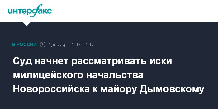 В частности, будут рассмотрены иски начальника УВД Новороссийска Владимира Черноситова и начальника УВД Приморского района города Валерия Медведева, которые считают себя опороченными А.Дымовским в его интернет-обращении, сообщили агентству "Интерфакс-Юг" в суде.