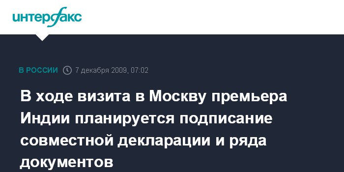 В ходе визита в Москву премьера Индии планируется подписание совместной декларации и ряда документов