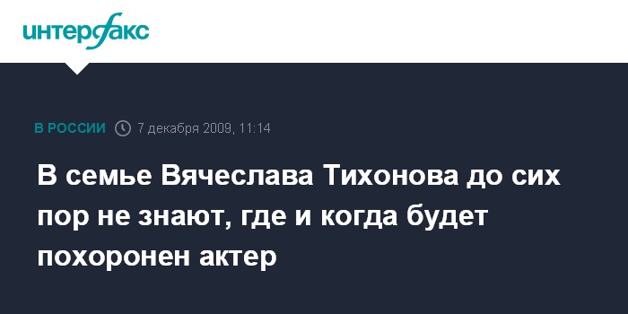Между тем, ранее в понедельник сообщалось, что Вячеслав Тихонов будет погребен в Москве в понедельник на Новодевичьем кладбище. Однако для официального подтверждения даты похорон необходима подпись мэра столицы Юрия Лужкова. Родные актера пока не обращались к руководству кладбища и место для похорон не выбирали.