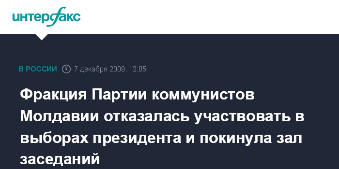 Москва. 7 декабря. INTERFAX.RU - В Молдавском парламенте, где утром в понедельник началась процедура выборов президента республики, фракция Партии коммунистов отказалась участвовать в них, заявила руководитель фракции Мария Постойко. Выступая с трибуны парламента, она отметила, что "ничего не изменилось после первых выборов 10 ноября".
