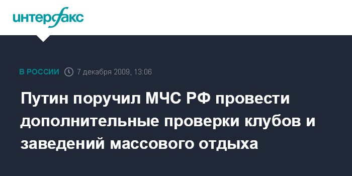 Москва. 7 декабря. INTERFAX.RU - МЧС России уже проводит дополнительные проверки клубов, концертных залов и аналогичных заведений массового отдыха, заявил премьер-министр Владимир Путин в понедельник на совещании по вопросам оказания медицинской помощи пострадавшим при пожаре в Перми.