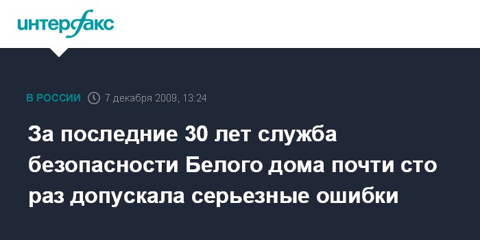 Вашингтон. 7 декабря. INTERFAX.RU - Служба безопасности Белого дома, начиная с 1980 года, 91 раз допускала нарушения требований безопасности при охране лидеров страны, сообщает в понедельник газета Washington Post.