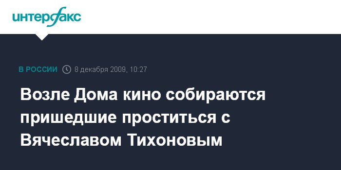 Москва. 8 декабря. INTERFAX.RU - Десятки людей уже пришли к Дому кино, чтобы проводить в последний путь народного артиста СССР Вячеслава Тихонова. Как передает корреспондент "Интерфакса", несмотря на то, что церемония прощания начинается в 11:00, уже сейчас возле Дома кино стоят десятки людей, которые ожидают начала панихиды, некоторые находятся там с 08:30. Люди принесли с собой розы и гвоздики, чтобы возложить их к гробу любимого актера.