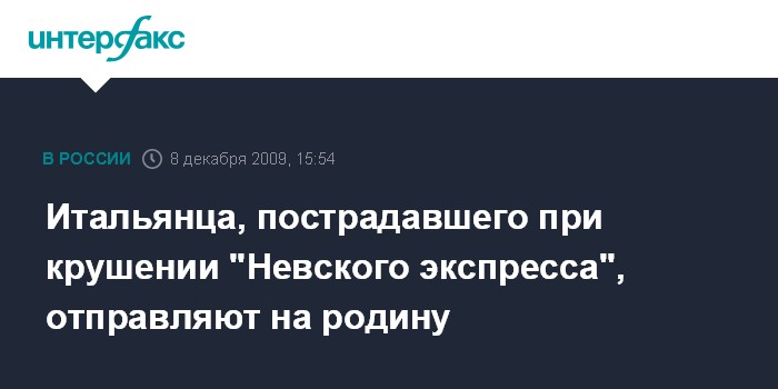 Москва. 8 декабря. INTERFAX.RU - Гражданина Италии, получившего серьезные травмы при крушении "Невского экспресса", во вторник отправят на родину, сообщил директор НИИ Скорой помощи им. Джанелидзе, где находится иностранец, Сергей Багненко.