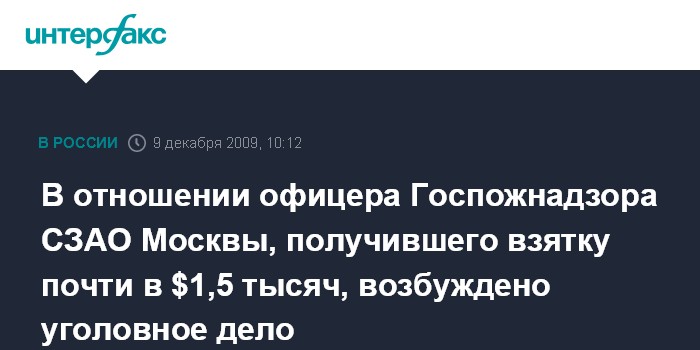 Москва. 9 декабря. INTERFAX.RU - В Москве уличен в получении взятки подполковник пожарной службы. Как заявил "Интерфаксу" в среду руководитель столичного управления СКП РФ Анатолий Багмет, начальник одного из отделов Госпожнадзора Северо-Западного административного округа Москвы в помещении служебного кабинета получил взятку в размере $1400 от представителя ООО "Диалит" "за заведомо незаконные действия".