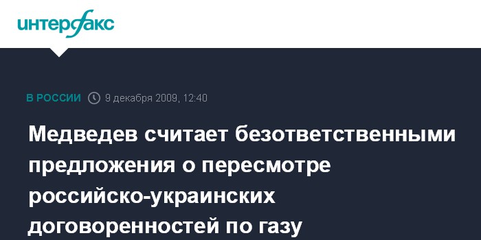 Москва. 9 декабря. INTERFAX.RU - Президент России Дмитрий Медведев считает возможным совершенствовать договорную базу российско-украинских соглашений по газу, но отказ от соблюдения этих соглашений считает безответственным. Российско-украинские договоры - по поставкам газа и по транзиту - действуют, и "я считаю абсолютно безответственными предложения пересмотреть эти договоры", сказал Медведев, выступая в Москве на форуме евразийских медиа.