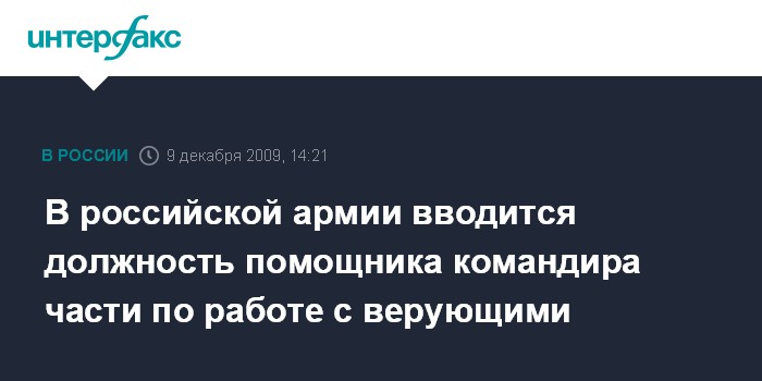 Москва. 9 декабря. INTERFAX.RU - В Вооруженных силах РФ с 1 декабря текущего года введена должность помощника командира воинской части по работе с верующими военнослужащими, заявил полковник Игорь Сергиенко, начальник отдела патриотического воспитания и работы с общественными объединениями Главного управления воспитательной работы ВС. По его словам, священнослужители будут непосредственно подчиняться командирам части и будут работать в соответствии с распорядком дня воинской части и только во внеслужебное время будут окормлять верующих в соответствии нормативно-правовыми актами, касающимися Вооруженных сил.