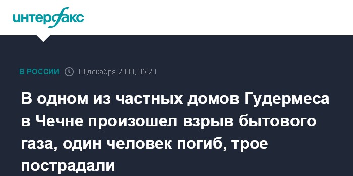 "В 4:25 мск в одноэтажном частном доме в городе Гудермеса взорвался бытовой газ, в результате чего один человек погиб, еще трое пострадали", - сообщили агентству "Интерфакс-Юг" в пресс-службе Южного регионального центра МЧС России в четверг.