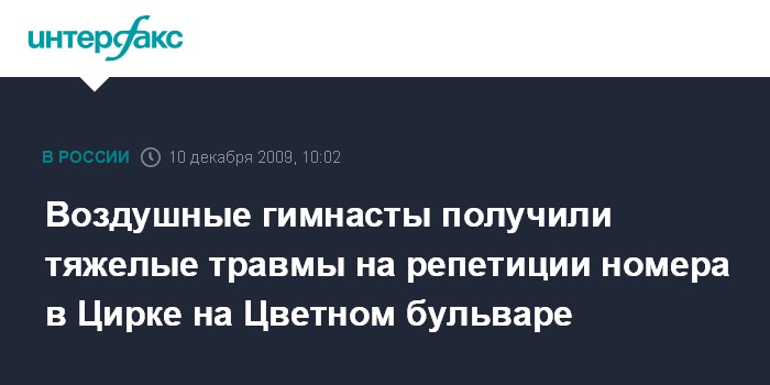 Москва. 10 декабря. INTERFAX.RU - Несчастный случай произошел в столичном Цирке на Цветном бульваре в среду вечером. Как сообщил "Интерфаксу" источник в медицинских кругах Москвы, во время репетиции номера, по неустановленным пока причинам, сорвались гимнасты Александр и Юлия Волковы. "Прибывшие на место медики обнаружили у Юлии черепно-мозговую травму, перелом основания черепа и перелом голени. Она срочно доставлена в НИИ им. Склифосовского", - сказал собеседник агентства. Он уточнил, что состояние женщины оценивается как тяжелое.