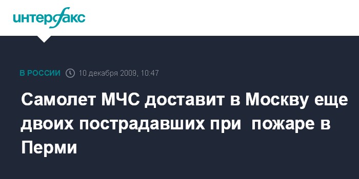 Москва. 10 декабря. INTERFAX.RU - Из Перми спецрейсом МЧС России в Москву везут еще двоих пострадавших при пожаре в ночном клубе. "Самолет МЧС России в 10:24 мск четверга вылетел из аэропорта Перми и направился в Москву", - сообщили "Интерфаксу" в управлении информации МЧС России.