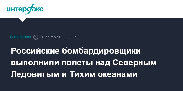 Москва. 10 декабря. INTERFAX.RU - Два российских стратегических бомбардировщика Ту-95МС провели воздушное патрулирование над нейтральными водами Северного Ледовитого океана и в акватории Тихого океана, сообщил "Интерфаксу-АВН" в четверг пресс-секретарь управления пресс-службы и информации Минобороны РФ по ВВС подполковник Владимир Дрик. На маршруте полета экипажи стратегических бомбардировщиков Ту-95МС сопровождались самолетами F-15 и F-4 западных стран, сказал собеседник агентства.
