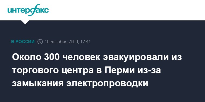 Москва. 10 декабря. INTERFAX.RU - Замыкание электропроводки банкомата произошло в четверг в крупном торговом центре "Алмаз" в Перми. "В результате из здания было эвакуировано около 300 человек", - сообщили агентству "Интерфакс-Поволжье" в пресс-службе ГУ МЧС РФ по Пермскому краю.