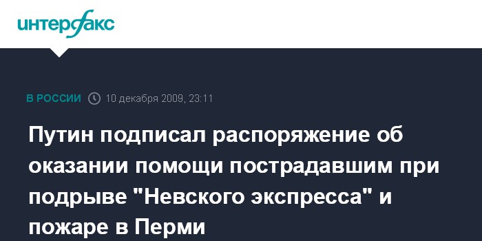 Москва. 10 декабря. ИНТЕРФАКС - Премьер-министр РФ Владимир Путин подписал распоряжение об оказании помощи семьям погибших и пострадавшим в крушении поезда "Невский экспресс", а также в результате пожара в Перми, сообщил журналистам пресс-секретарь премьера РФ Дмитрий Песков.