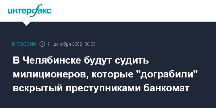 Москва. 11 декабря. INTERFAX.RU - В суд Центрального района Челябинска направлено уголовное дело в отношении четырех милиционеров, обвиняемых в злоупотреблении полномочиями и хищении чужого имущества. Как сообщает в пятницу следственное управление СКП РФ по Челябинской области, сотрудники отдельной роты патрульно-постовой службы милиции УВД по Центральному району Челябинска в феврале 2009 г. в ночное время по вызову прибыли в блок горбольницы N 1, где неизвестные вскрыли банкомат ОАО "Челябинвестбанка" и похитили из него 1 млн 907 тыс. 700 рублей. "Ожидая прибытия следственно-оперативной группы, обвиняемые обнаружили, что в открытом преступниками банкомате находятся еще две пластиковые кассеты с купюрами номиналом 100 и 50 рублей. Используя металлическую протирку пистолета Макарова в качестве орудия преступления, злоумышленники вскрыли кассеты и похитили из нее 126 тыс. рублей", - говорится в сообщении. Дождавшись прибытия следственно-оперативной группы, милиционеры с похищенными деньгами покинули место происшествия.