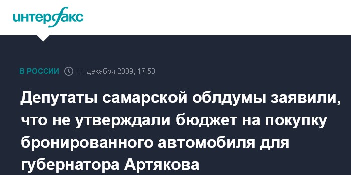 Москва. 11 декабря. INTERFAX.RU – Региональное Заксобрание при рассмотрении областного бюджета не утверждало такой статьи расходов, как покупка эксклюзивного бронированного седана "Мерседес" за 22,4 млн рублей для губернатора Владимира Артякова, заявил депутат самарской областной думы Михаил Матвеев.