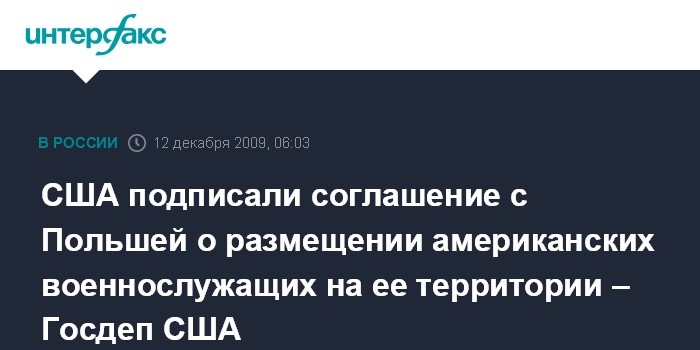 Вашингтон. 12 декабря. ИНТЕРФАКС - США и Польша подписали соглашение о статусе американских вооруженных сил на территории Польши, сообщил в пятницу на брифинге в госдепартаменте США пресс-секретарь американского дипведомства Иэн Келли.