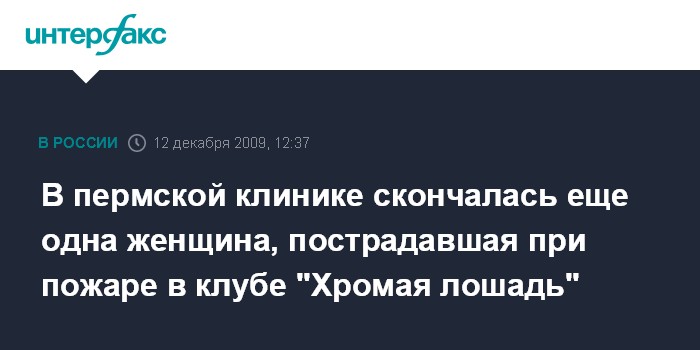 Москва. 12 декабря. INTERFAX.RU - В одной из пермских клиник в субботу утром скончалась женщина, пострадавшая во время пожара в пермском клубе "Хромая лошадь" 5 декабря.