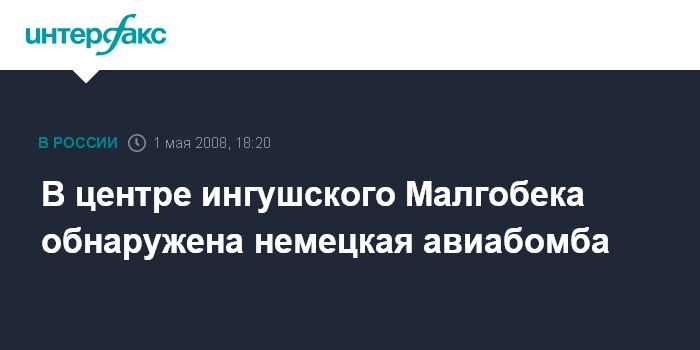 Назрань. 1 мая. ИНТЕРФАКС-ЮГ - В центральном сквере города Малгобека (Ингушетия) строители в ходе ремонтных работ обнаружили авиационную бомбу времен Великой Отечественной войны.