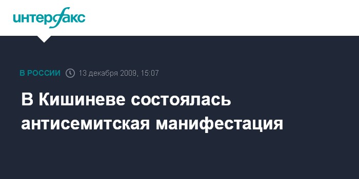 Кишинев. 13 декабря. INTERFAX.RU - Несколько десятков человек приняли участие в антисемитской манифестации в центре Кишинева в воскресенье. Участники акции протеста, которые представились "православными христианами", заявили, что они не допустят, чтобы "Молдавия управлялась евреями". Участники акции, которая состоялась в сквере центрального парка Кишинева, скандировали антисемитские лозунги. Они сорвали еврейскую символику и атрибуты, которые были установлены в парке в минувшую пятницу по случаю еврейского праздника "Ханука". В акции принимали участие и несколько человек в одеяниях священников. Полиция в действия манифестантов не вмешивалась, хотя несколько патрулей следили за порядком.