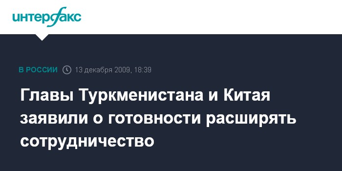 Ашхабад. 13 декабря. INTERFAX.RU - Взаимную готовность сторон к расширению и углублению сотрудничества выразили в ходе состоявшейся в воскресенье встречи президент Туркменистана Гурбангулы Бердымухамедов и председатель Китайской Народной Республики Ху Цзиньтао, прибывший в Туркменистан с двухдневным рабочим визитом. Главы Туркмении и КНР обменялись мнениями по ключевым направлениям сотрудничества, подтвердив обоюдную заинтересованность сторон в интенсификации политического диалога.