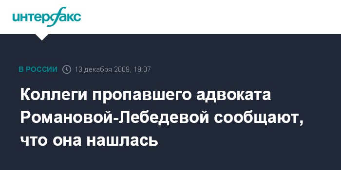 Москва. 13 декабря. INTERFAX.RU - Нашлась пропавшая в середине недели адвокат одного из фигурантов дела о захвате сухогруза "Арктик Си" Елена Романова-Лебедева, сообщают ее коллеги. "Помощница Елены позвонила и сказала: "Жива, здорова, нашли", - сказал "Интерфаксу" в воскресенье адвокат другого фигуранта этого дела Омар Ахмедов. Он сказал, что не обладает более подробной информацией, при этом отметил, что, вероятнее всего, его коллегу нашли с помощью сотрудников правоохранительных органов. "Интерфакс" не располагает комментариями правоохранительных органов по поводу этой информации.