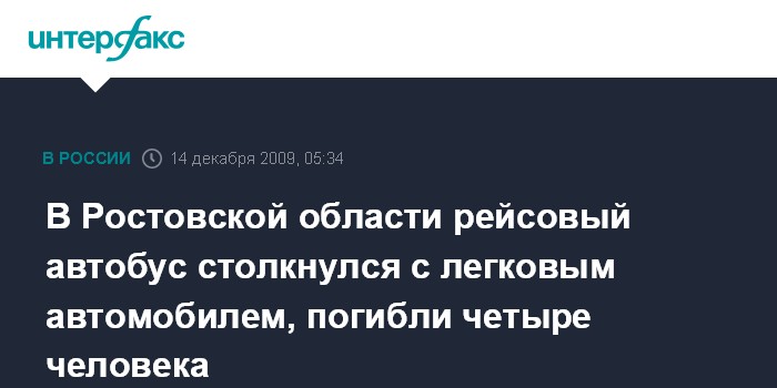 Ростов-на-Дону. 14 декабря. ИНТЕРФАКС-ЮГ - В Ростовской области на автотрассе "Дон" в ночь на понедельник рейсовый автобус "Ивеко" столкнулся с легковым автомобилем, четыре человека погибли, 10 пострадали.