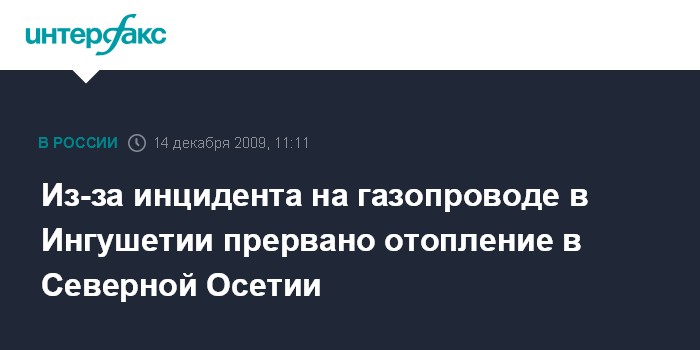 Москва. 14 декабря. INTERFAX.RU - Подача газа котельным, отапливающим населенные пункты Северной Осетии, из-за минирования газопровода в Ингушетии остановлена - с ночи воскресенья люди остались без отопления и горячей воды, закрыты образовательные учреждения.