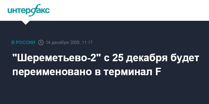 Москва. 14 декабря. INTERFAX.RU - Международный терминал аэропорта "Шереметьево" - "Шереметьево-2" - с 25 декабря будет переименован в терминал F (SVO-F), говорится в сообщении АО "Аэрофлот - российские авиалинии".
