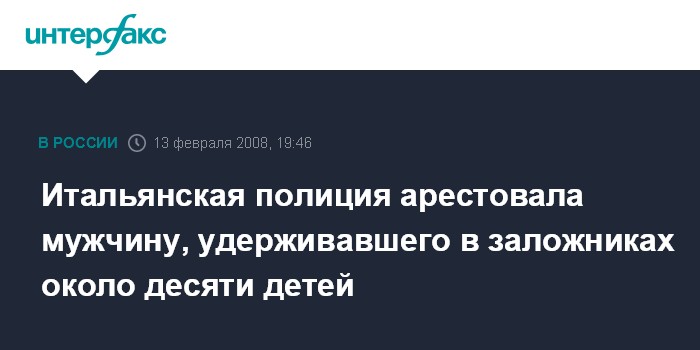 Рим. 13 февраля. INTERFAX.RU - Полиция задержала в среду мужчину, в течение пяти часов удерживавшего в заложниках около десяти детей в детском саду в городе Реджо-ди-Калабрия, на юге Италии.