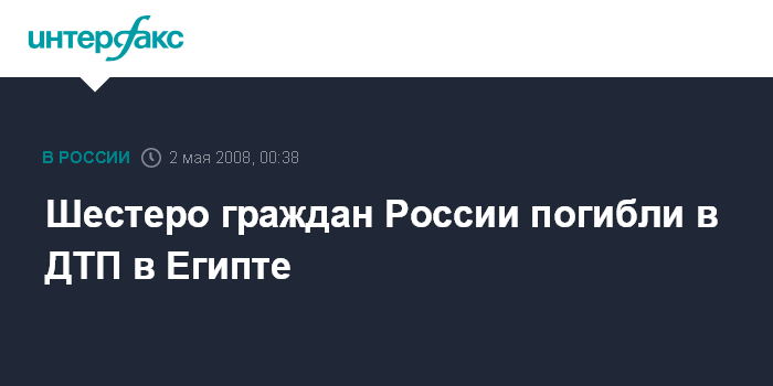 Москва. 2 мая. ИНТЕРФАКС - На египетской трассе Шарм-эль-Шейх - Каир перевернулся и сгорел экскурсионный автобус. В ДТП погибли шестеро россиян.