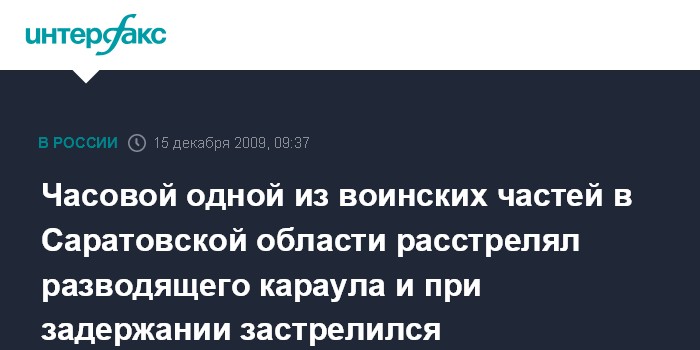 Москва. 15 декабря INTERFAX.RU - Часовой по охране склада зенитно-ракетного полка в городе Энгельс (Саратовская область) в 21:00 мск в минувший понедельник во время смены караула произвел очередь из автомата по разводящему, который скончался от полученных ранений, сообщили "Интерфаксу-АВН" в управлении пресс-службы и информации Минобороны РФ.