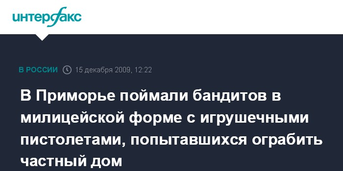 Москва. 15 декабря. INTERFAX.RU – Во Владивостоке обезврежена банда налетчиков, попытавшаяся под видом вооруженных сотрудников милиции проникнуть в частный дом на улице Сельская, сообщает во вторник пресс-служба УВД по Приморскому краю.