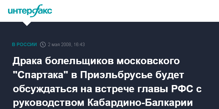 Нальчик. 2 мая. ИНТЕРФАКС-ЮГ - Президент Российского футбольного союза (РФС) Виталий Мутко намерен обсудить с руководством Кабардино- Балкарии инцидент с массовой дракой болельщиков футбольного клуба "Спартака" (Москва) с местными жителями в Приэльбрусье.