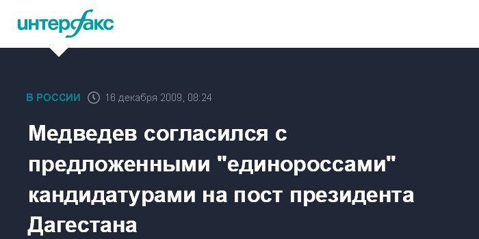 Москва. 16 декабря. INTERFAX.RU - Президент РФ Дмитрий Медведев согласился со списком кандидатур, предложенных партией "Единая Россия" на должность президента Республики Дагестан, сообщила в среду пресс-служба Кремля.