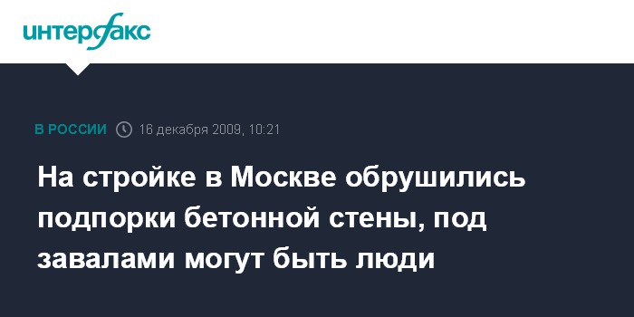 Москва. 16 декабря. INTERFAX.RU - Обрушение подпорок бетонной стены произошло в среду в Северном округе столицы на улице Поликарпова в районе строения 23А, сообщил "Интерфаксу" начальник пресс-службы ГУ МЧС по Москве Евгений Бобылев. "В котловане на строительной площадке около здания ОКБ "Сухой" обрушились подпорки бетонной стены", - сказал он, добавив, что, по предварительной информации, под рухнувшими конструкциями может находиться один человек, в настоящее время эта информация проверяется.