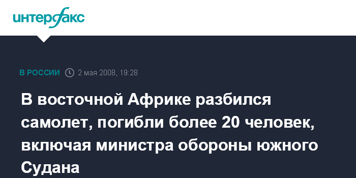 Лондон. 2 мая. ИНТЕРФАКС - Около 20 человек, включая министра обороны южного Судана Доминика Дима, погибли в авиакатастрофе в восточной Африке, сообщает британская телерадиокорпорация Би-би-си.